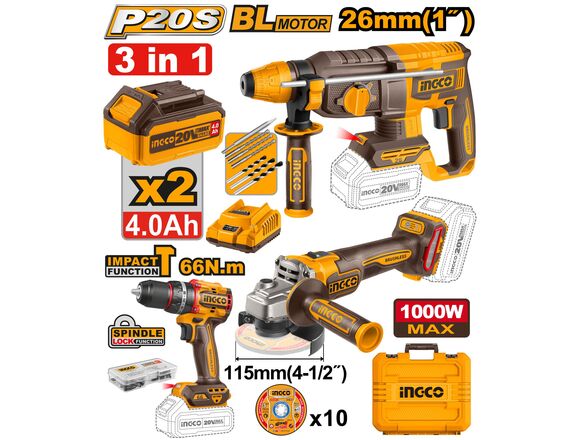 Набор "АКЦИЯ" Б/Щ INGCO "20V MAX" 3 в 1 шуруп удар 66Нм+УШМ 125мм+перф26мм, 2АКБ+ЗУ, КЕЙС/диски(1/4)