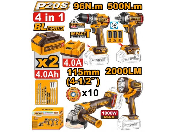 Набор Б/Щ "20V MAX" INGCO INDUSTRIAL 4 в 1 УШМ125мм/Гайк500Нм/Шуруп96Нм/Фонарь2000Лм АКБ2*4Ач+ЗУ 1/2