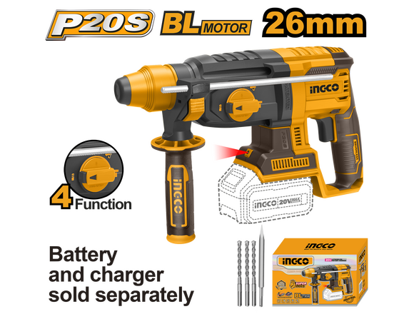 Аккумуляторный перфоратор INGCO CRHLI20268 предназначен для сверления отверстий в бетоне, кирпиче и природном камне, а также для легких долбежных работ. Он также пригоден для сверления отверстий в древесине, металле, керамике и синтетических материалах.