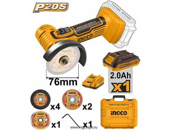 УШМ МИНИ "20V MAX" INGCO 76мм, 7 дисков, 1АКБ*2Ач+ЗУ, КЕЙС (1/4)
