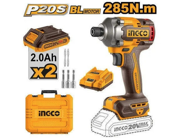 Винтоверт Б/Щ ударный 20V MAX" INGCO INDUSTRIAL 1/4" 285Нм, 2АКБ*2Ач/ЗУ/КЕЙС, LED (1/4)