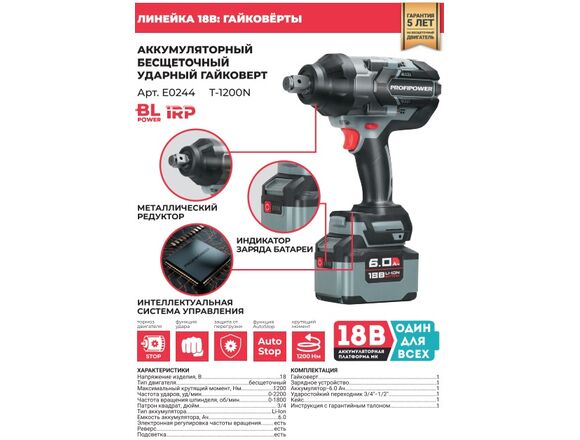Гайковерт Б/Щ УДАРНЫЙ "ONE-MK" PROFIPOWER 3/4" 18В, 1200Нм, АКБ1*6Ач+З/У, КЕЙС (1/5)