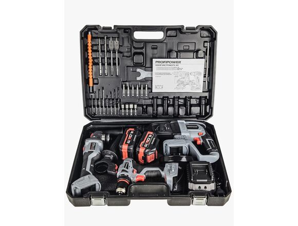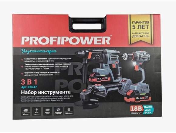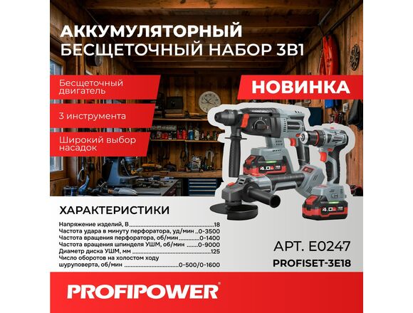 НАБОР Б/Щ 3в1 PROFIPOWER в КЕЙСЕ NEW:УШМ E0080 + шуруп T0056 + перф Т0058 (АКБ 2шт*4Ач, З/У) (1/3)