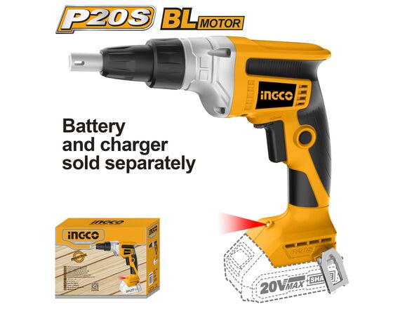Шуруповерт для гипсокартона Б/Щ "20V MAX" INGCO INDUSTRIAL 30Нм (без АКБ/ЗУ) (1/5)