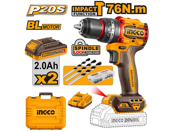 Шуруповерт Б/Щ УДАРНЫЙ "20V MAX" INGCO INDUSTRIAL 76Нм, БЗП металл 13мм, 2АКБ+ЗУ, КЕЙС (1/5)