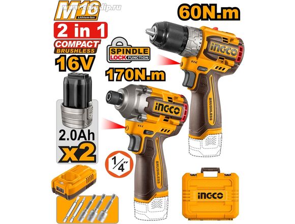 Набор "АКЦИЯ" Б/Щ "M16" INGCO INDUSTRIAL 2 в 1, шуруп 60Нм + винт 170Нм, 2АКБ*2Ач+ЗУ, КЕЙС (1/4)