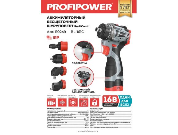 Шуруповерт Б/Щ Комби PROFIPOWER 5 в 1 16В 40Нм 2АКБ*2Ач + ЗУ, КЕЙС (1/5)