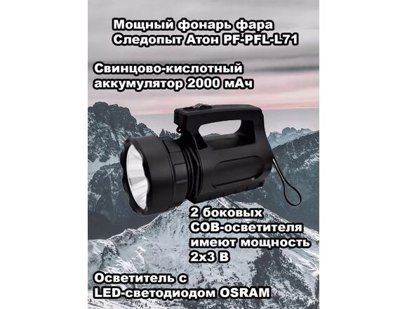 Фонарь ручной аккумуляторный СЛЕДОПЫТ с ручкой "АТОН" 1 LED + 2 COB, 2000мА*ч, 220B