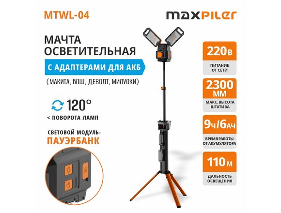 Мачта осветительная MAXPILER 7000лм, 2300мм (4 платформы под разные АКБ), МАГНИТ / КРЮК