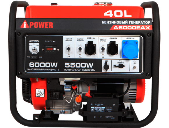 A-iPower A6000EAX оснащен компактным гильзованным 4-тактный OHV-двигателем объемом 389 куб. см с электрическим стартером. На панели управления находится две стандартные розетки 230В/16А, одна силовая розетка 230В/32А, и разъем USB, от которого можно подзарядить смартфон, планшет и другие гаджеты. На цифровой дисплей в режиме реального времени выводятся сведения о работе генератора. Генератор имеет выход для подключения АВР, с возможностью организации источника резервного питания для загородного дома, магазина или кафе.