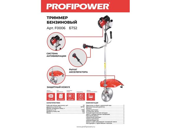 Бензотриммер PROFIPOWER БТ52 52см³ (1,5кВт) 26мм паук/диск/плечевой ремень в компле (1/1)