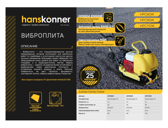 Виброплита бензиновая HANSKONNER 100кг 4,8лс,67*46см,5400виб/мин,Honda GX160,коврик,колеса