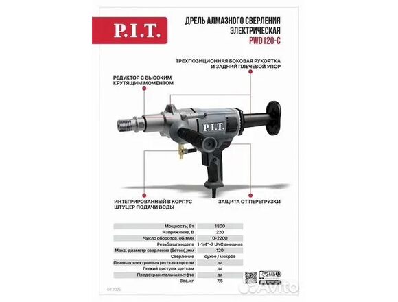 Дрель алмазного сверления P.I.T. ULTRA 1800Вт, 0-2200 об/мин, 1 1/4 до ⌀120мм,