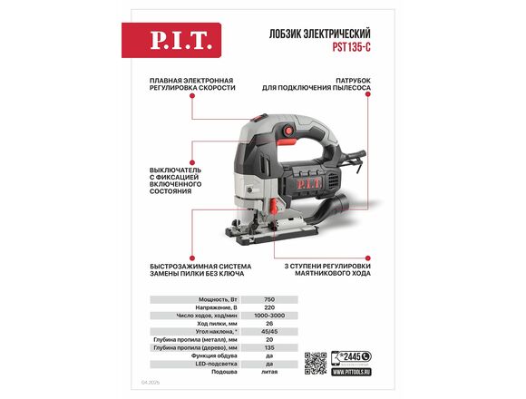 Лобзик электрический P.I.T. 750Вт 135мм 1000-3000ход/мин БЗП, маятник, ход 26мм,