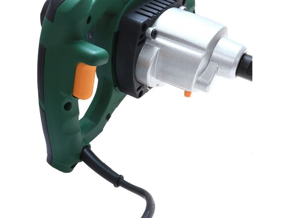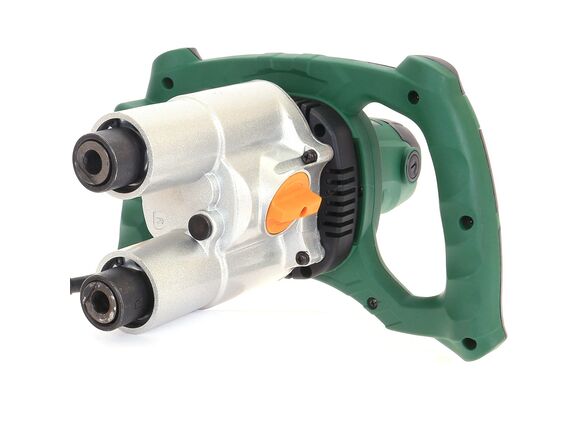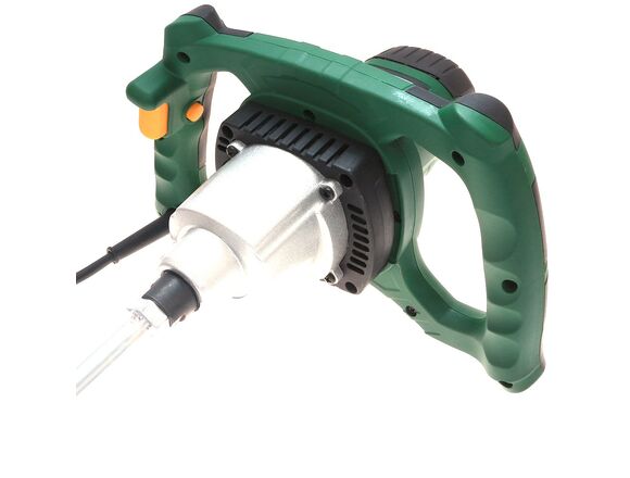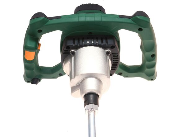 Рукоятка миксера имеет два боковых захвата. Благодаря такой конструкции инструмент удобно удерживать в вертикальном положении. Зоны хвата на рукоятке имеют особый рельеф и оснащены прорезиненными вставками – при работе миксер не выскальзывает из рук. Инструмент весит всего 5,5 кг, поэтому пользователь устает несильно. Кнопка пуска блокируется – при продолжительной работе не нужно жать на нее непрерывно.