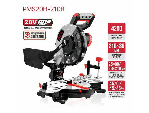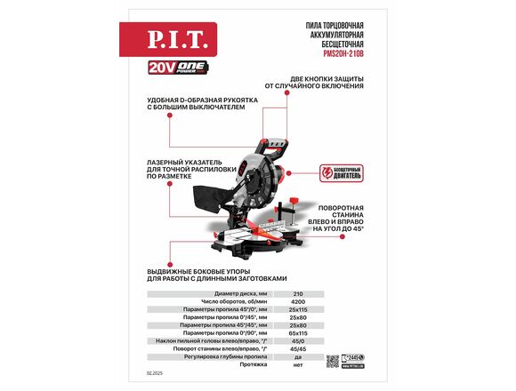 Пила торцовочная Б/Щ OnePower P.I.T. 20В Ø210мм наклон 45°, ЛАЗЕР SOLO