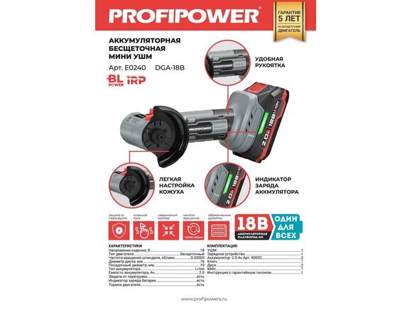 УШМ Б/Щ МИНИ "ONE-MK" PROFIPOWER 18В 76мм 2АКБ*2Ач+ЗУ, 2 диска, КЕЙС (DGA-18B) (1/5)