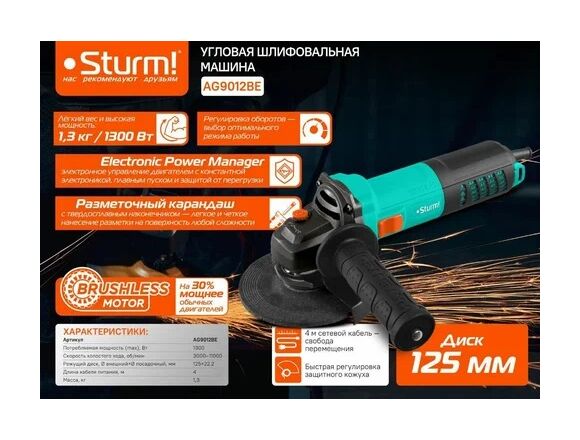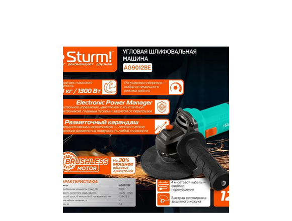 УШМ Б/Щ STURM 125мм 1300Вт (3000-11000об/мин) поддержание оборотов под нагрузкой/плав пуск (1/6)