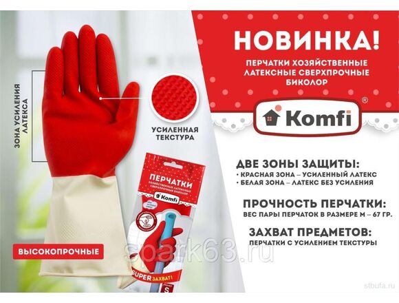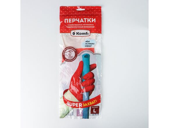 Перчатки KOMFI хозяйственные латексные СВЕРХПРОЧНЫЕ БИКОЛОР L /белый+красный (12/144)