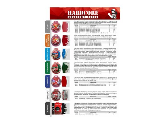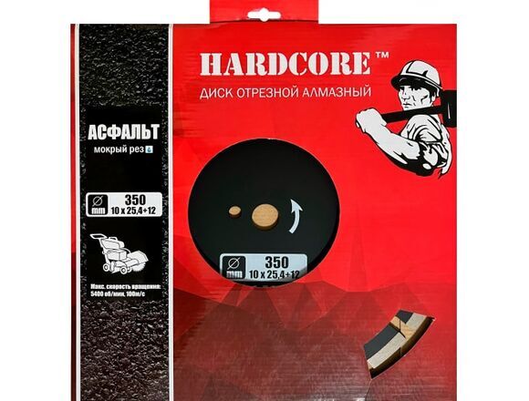 Диск алмазный Асфальт 350x3.2x10x25.4+12 мм Hardcore 186350 имеет максимально большие промежутки между сегментами для улучшения отвода пыли при резке высокоабразивного материала, которым является асфальт. Также диск имеет заходящие внутрь корпуса сегменты скошенной формы, для предохранения места соединения всех сегментов и корпуса от истирания. Диск может резать на сухую, но для значительного продления его срока службы необходимо резать с подачей воды для охлаждения.