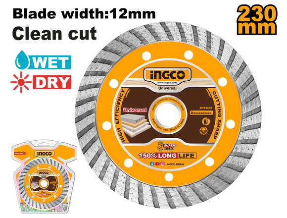 Диск алмазный TURBO 230 мм INGCO DMD032301 предназначен как для сухой, так и для мокрой резки кирпича, гранита, известняка, мрамора, асфальта, плитки, бетона, натуральный и искусственный камень с помощью угловой шлифовальной машины.