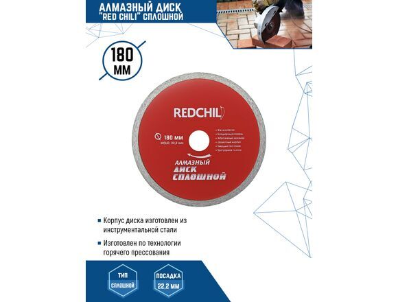 Алмазный диск сплошной 180х22 мм Redchili 07-07-07-17 предназначен для резки железобетона, камня, мрамора, шамотного кирпича, песчаника, тротуарной плитки с помощью угловой шлифовальной машины.