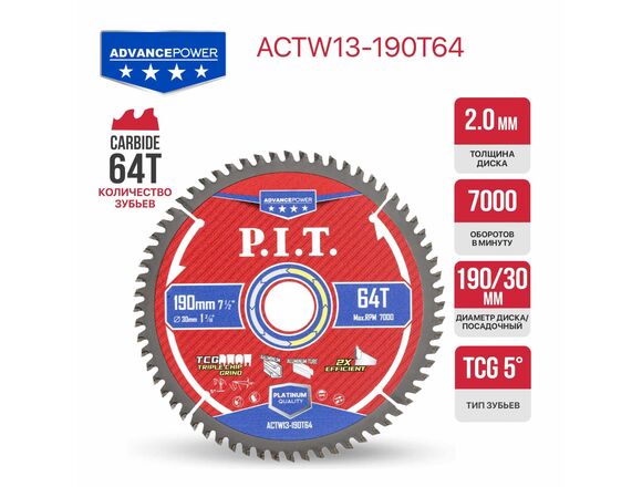 Диск пильный по алюминию P.I.T. ADVANCE 190*30*2.0мм 64T Carbide, зуб TCG 5°