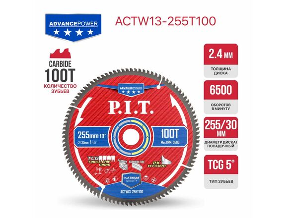 Диск пильный по алюминию P.I.T. ADVANCE 255*30*2.4мм, 100T Carbide, зуб TCG 5°