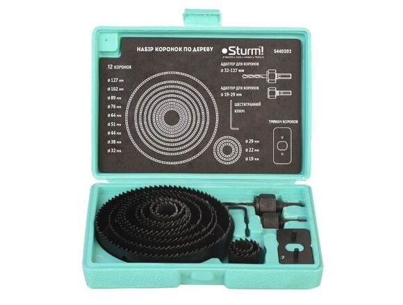 Набор коронок Sturm 5440202 предназначен для выполнения отверстий в древесине различных диаметров. В наборе коронки диаметром: 19 мм, 22 мм, 29 мм, 32 мм, 38 мм, 44 мм, 51 мм, 64 мм, 76 мм, 89 мм, 102 мм, 127 мм. Зубья пил закалены и усилены. Продукты пиления легко удаляются через боковую прорезь. В комплекте поставляются две державки с центрирующим сверлом и шестигранный ключ.