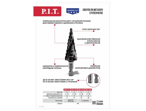 Сверло по металлу ступенчатое P.I.T. ADVANCE 4-12мм шаг 5*2мм 4 спирали HEX1/4"