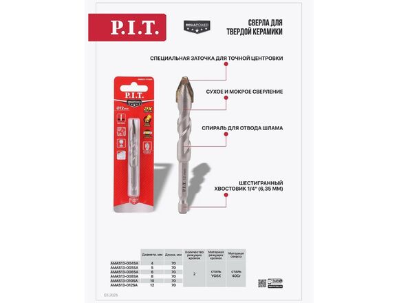 Сверло для твердой керамики P.I.T. DRUA Ø 5*70мм, 2 реж. кромки, спираль, хв. 1/4" (AM