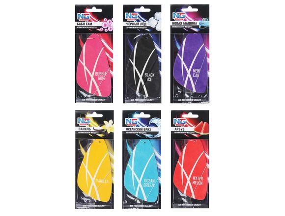 Ароматизатор NEW GALAXY Galaxy, бабл гам, ваниль, океанский бриз, арбуз, черный лед, новая машина 794-572 может располагаться в любом месте машины и обеспечивать в салоне приятный аромат и нейтрализацию посторонних запахов на длительное время. В обиходе этот вид ароматизаторов еще называют "елочка".