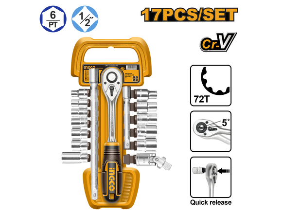 Набор головок с трещоткой и удлинителями INGCO INDUSTRIAL 1/2" 17 предметов (10/50)