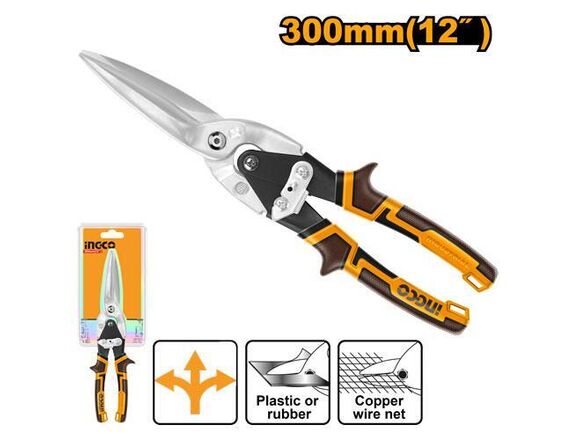 Ножницы по металлу INGCO прямые удлинённые 290 мм HTSN0112S - удобный ручной инструмент, который подойдет для резки с различными материалами, например, сталью, цветными металлами, пластиком, резиной, кожей, картоном, а также 0,5 мм латунной проволоки.