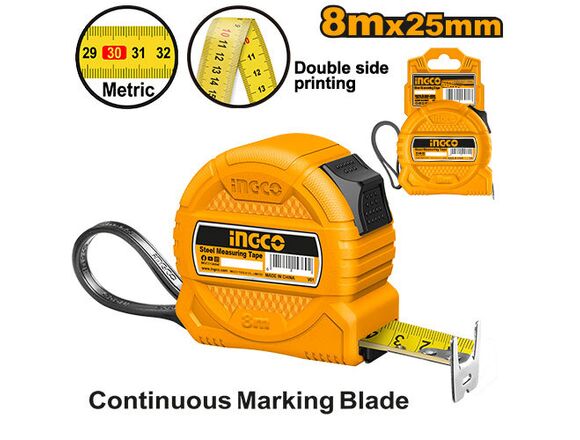 Рулетка INGCO 8м*25мм, 2-х стороняя шкала и зацеп, с подвесом (12/48)