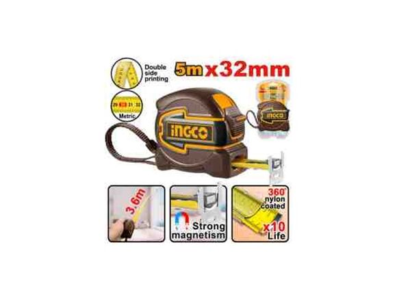 Рулетка INGCO INDUSTRIAL 5м*32мм (вылет 3,6м), НЕЙЛОН, СУПЕРМАГНИТ, 2-х стороняя шкала (6/36)