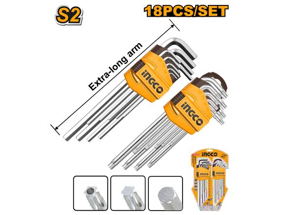 Набор шестигранных ключей INGCO 18 шт. HEX1,5-10мм, TORX Т10-Т50 INDUSTRIAL HHKSET0181 служит для монтажа и демонтажа крепежа с внутренним шестигранным или звездообразным (Torx) шлицем.