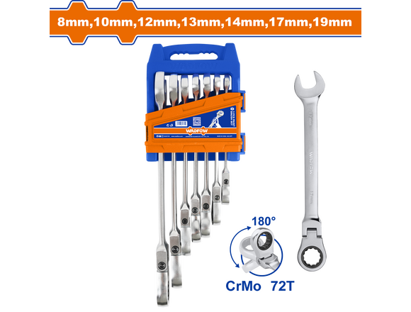 Набор ключей комбинированных с трещоткой шарнирных WADFOW 7 шт 8-19мм (1/18)