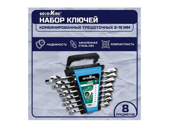 Набор ключей комбинированных трещоточных GOODKING 8 шт (8-19мм) с холдером