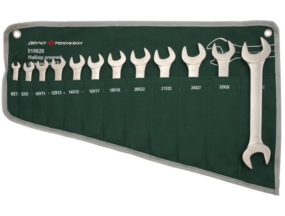 Корпус набора рожковых ключей 12шт сумка Дело Техники 510620 выполнен из хромванадиевой стали, которая обладает долгим сроком службы.