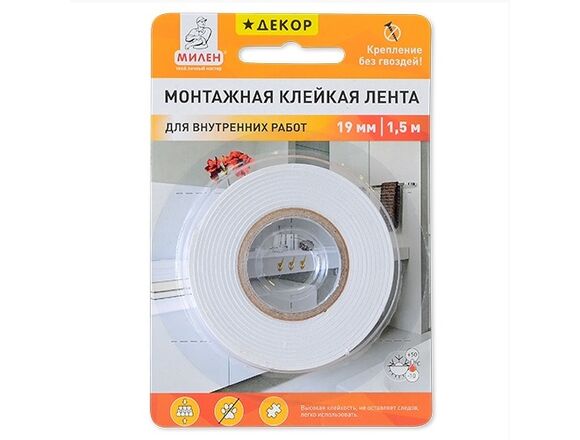 Лента двухсторонняя Милен ДЕКОР для внутренних работ 19мм*1,5м "Крепление без гвоздей!" (1/30)