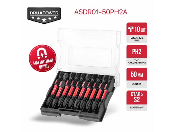 Бита ударная магнитная P.I.T. DRUA PH2x50 мм, IMPACT, торсионная зона, 10 шт, кейс (A