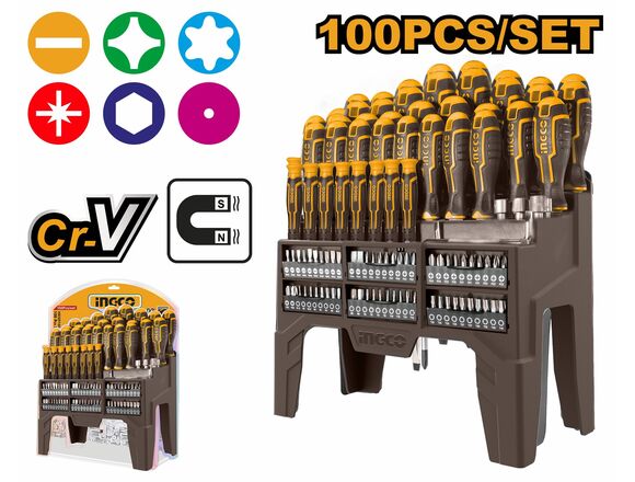 Набор отверток и бит INGCO INDUSTRIAL 100шт (40/60шт) + подвес и стойка-держатель (4/80)