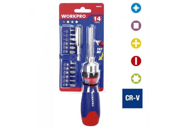 Отвертка с набором бит WORKPRO 14шт, храповый механизм