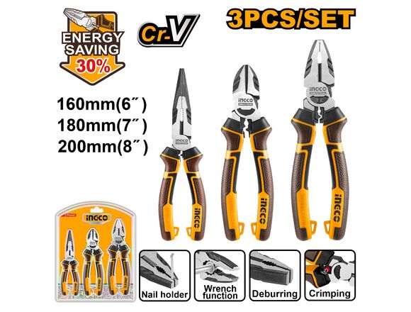 Набор шарнирно-губцевого инструмента усиленные 3 пред. INGCO HKHLPS2831 INDUSTRIAL - комплект шарнирно-губцевого инструмента, состоящий из трех предметов: комбинированных плоскогубцев, бокорезов и длинногубцев.Такой набор очень удобен для выполнения различных операций в области слесарно-монтажных работ.Инструменты изготовлены из хромованадиевой стали Cr-V характеризующаяся повышенной устойчивостью к коррозии и образованию ржавчины.Двухкомпонентные эргономичные рукоятки плоскогубцев обеспечивают комфорт при работе и исключают выскальзывание инструмента из рук.Инструменты обладают усиленной конструкцией и оптимизированной рычажной передачей, которая позволяет работать на 30% эффективнее.