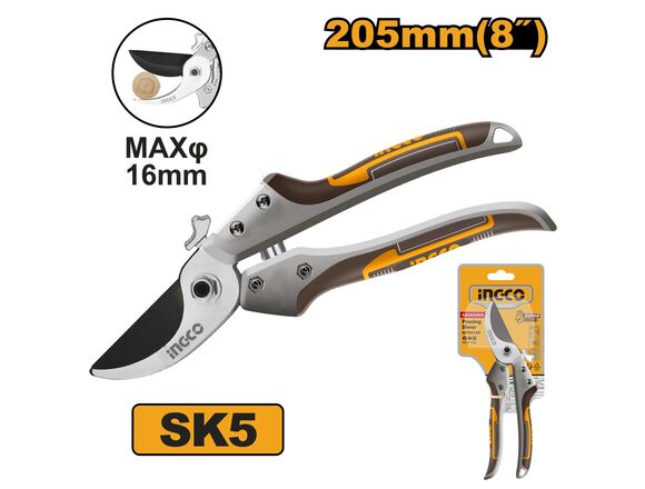 Секатор INGCO 205 мм HPS0308 предназначен для резки молодых побегов и срезания цветов. Для безопасного хранения предусмотрен фиксатор блокировки. Он располагается так, что его с легкостью можно переключить одной рукой. Для легкости работы лезвия покрыты тефлоном. Термообработанные алюминиевые ручки с мягким захватом TPR обеспечивают комфорт в процессе использования.