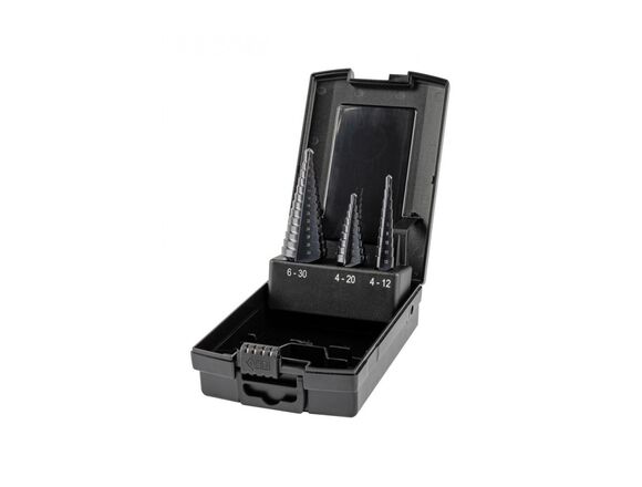 Набор свёрл ступенчатых, 3 пр., HSS TiAlN, Gr.1/2/3, Ø4-12, 4-20, 6-30 мм, прямая канавка, трёхплоск