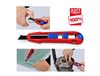 90 10 165 BK KNIPEX cutix Инновационная, регулируемая, телескопическая стабилизационная планка – универсальное использование, быстрый результат, точный рез. Целенаправленное усилие может прилагаться на тыльную сторону лезвия без риска получения травм, исключен риск случайного сгибания или разлома лезвия. Надежный и прочный корпус из магниевого сплава – такой же легкий, как из пластика, и настолько же прочный, как из литого под давлением алюминия. Надежное крепление лезвия благодаря высококачественному фиксатору лезвия – надежная фиксация при резке, сдвигании и зачистке. Компактность – длина 165 мм, вес около 111 г. Высококачественные отламывающиеся лезвия, 2 запасных лезвия в ручке и возможность замены без применения инструментов. Подходит для стандартных типов лезвий на 18 мм – гладкие, изогнутые, с крючками. Надежный захват и удобный хват благодаря узкой форме и многочисленным зонам захвата. Плоские, эргономичные отдельные ползунки для лезвия и стабилизирующей планки.