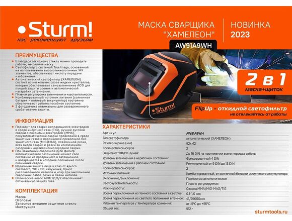 Маска сварщика Sturm AW91A5WH обеспечивает надежную защиту лица и глаз. Имеет плавные регулировки светочувствительности и времени задержки.