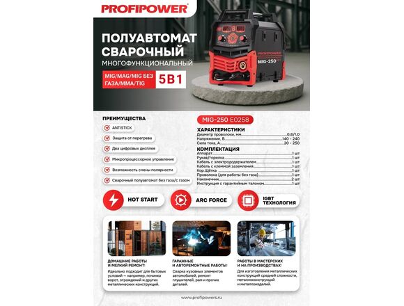 Инвертор сварочный ПОЛУАВТОМАТ PROFIPOWER 250А 4 в 1 (MIG/MAG//ММА/TIG) (MIG-250) (1/1)